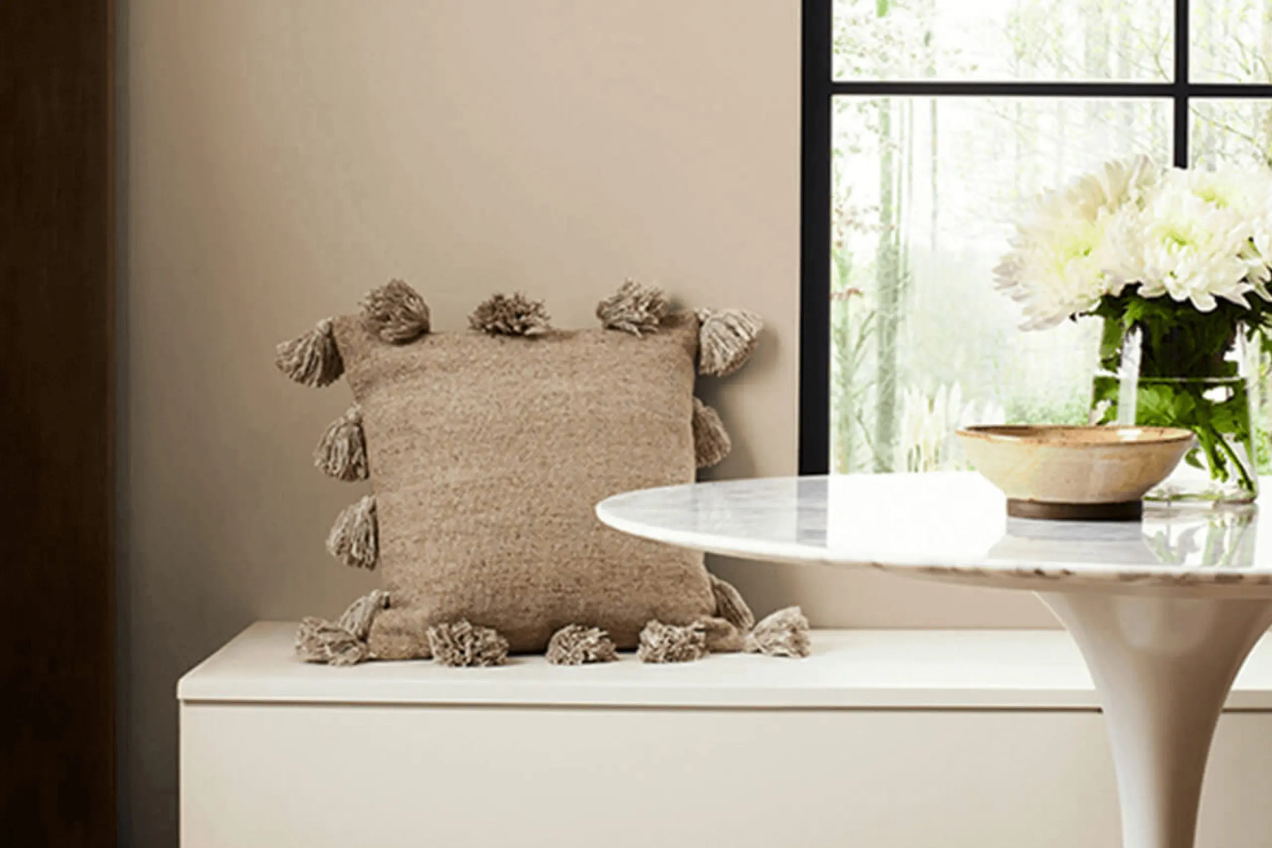 Using a lighter trim shade like Moderate White or a slightly darker and contrasting tone like Mindful Gray can adjust the mood and perception of the area painted with the beige tone.