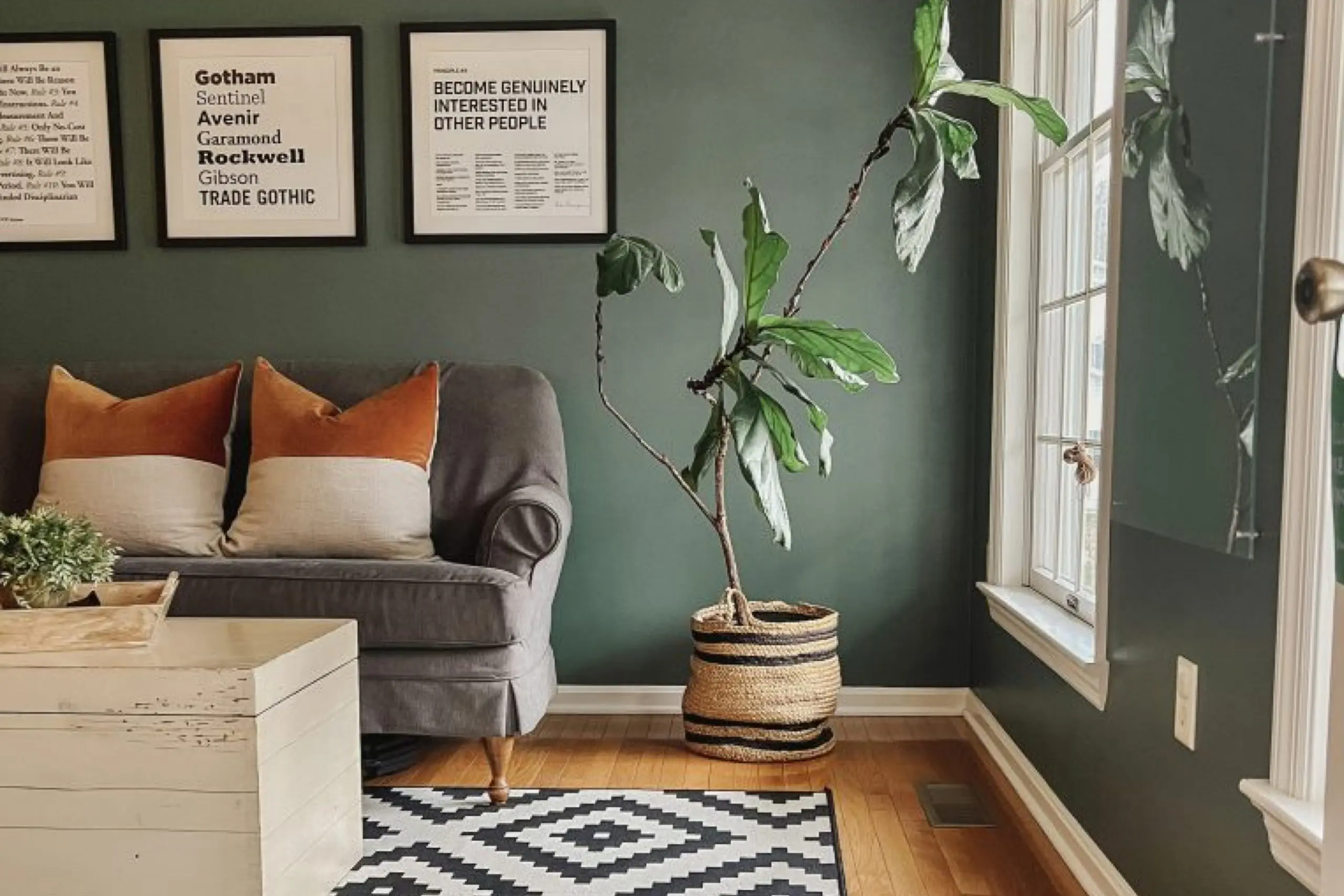 West-facing rooms get light in the afternoon and evening. Here, Caldwell Green can look warm and inviting as the sunlight adds a golden hue to the color later in the day.