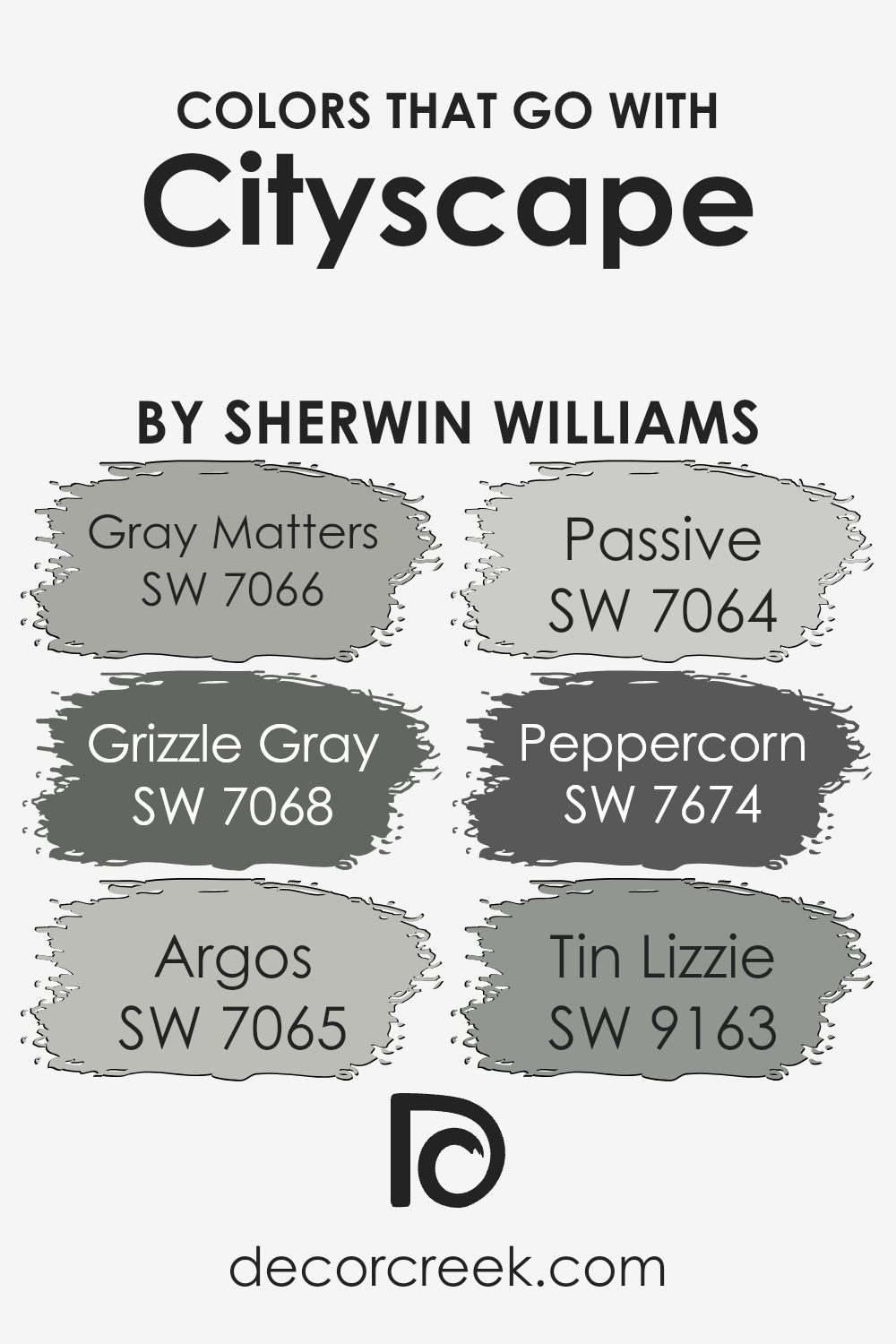 Choosing the right colors to complement Cityscape SW 7067 by Sherwin Williams is crucial because it ensures that the overall design remains harmonious and visually appealing. Colors like Gray Matters, Grizzle Gray, Argos, Passive, Peppercorn, and Tin Lizzie each play a distinct role in enhancing the muted elegance of Cityscape, making sure that the space maintains a cohesive look.