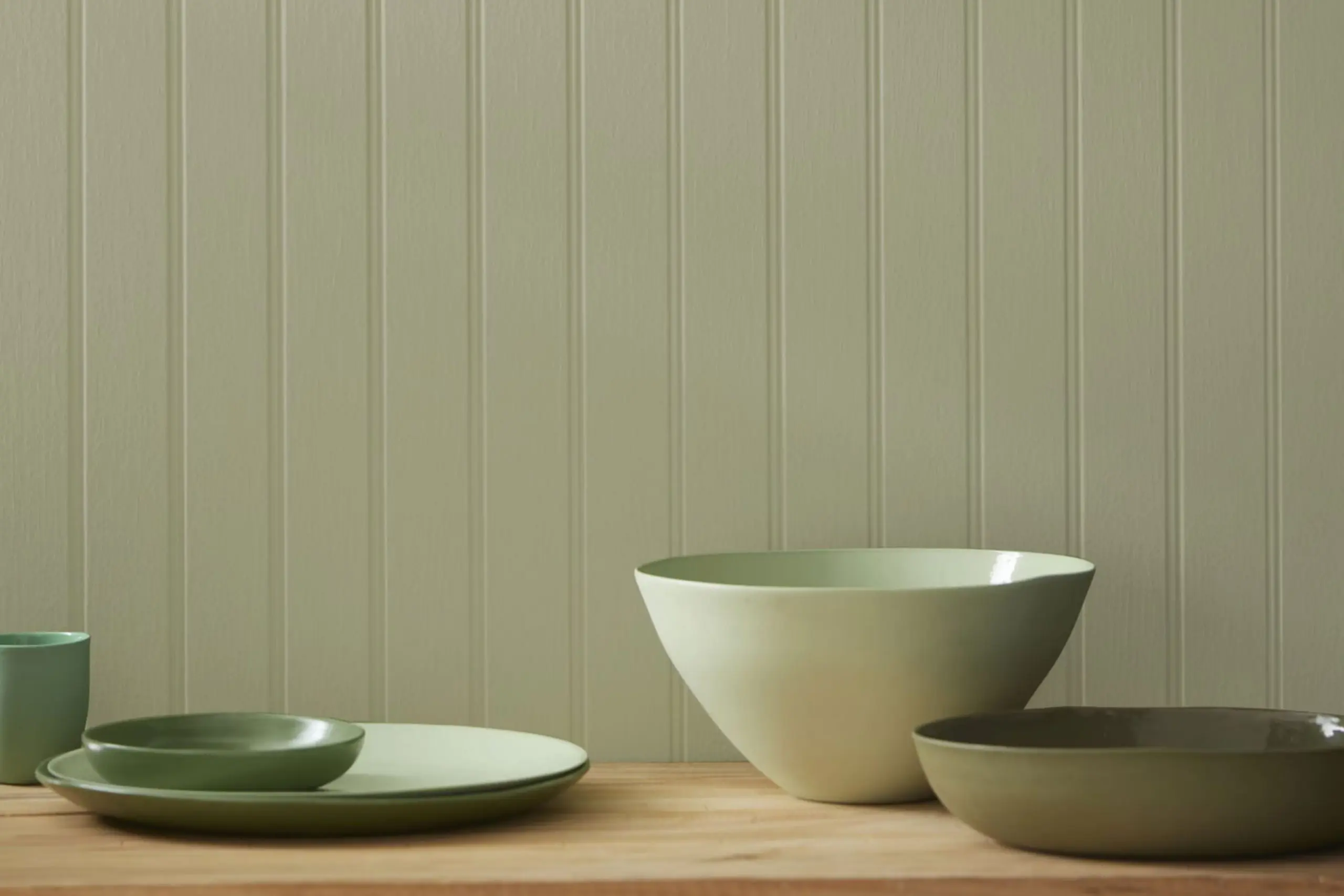 Silver Sage (506) is a gentle gray-green that offers soft contrast, ideal for a subtle, muted look beside the richer tone of Cypress Green. Hint of Mint (505) adds a light, airy freshness that brightens a room while maintaining harmony with other greens.