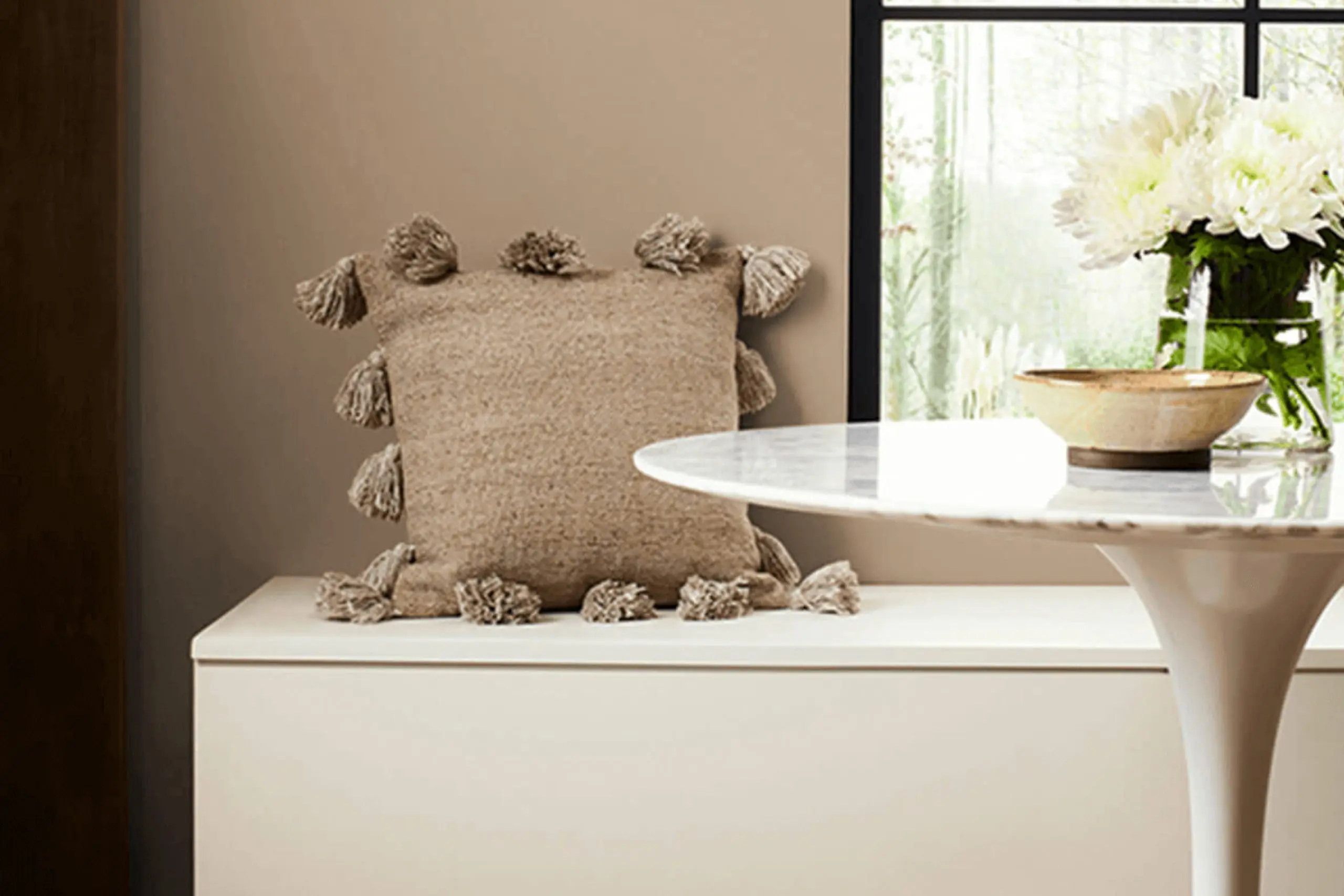 This contrast enhances the warmth and richness of Dormer Brown, keeping it from feeling too heavy in a room. Greek Villa is a soft, creamy white that adds a hint of elegance while allowing other colors to stand out.