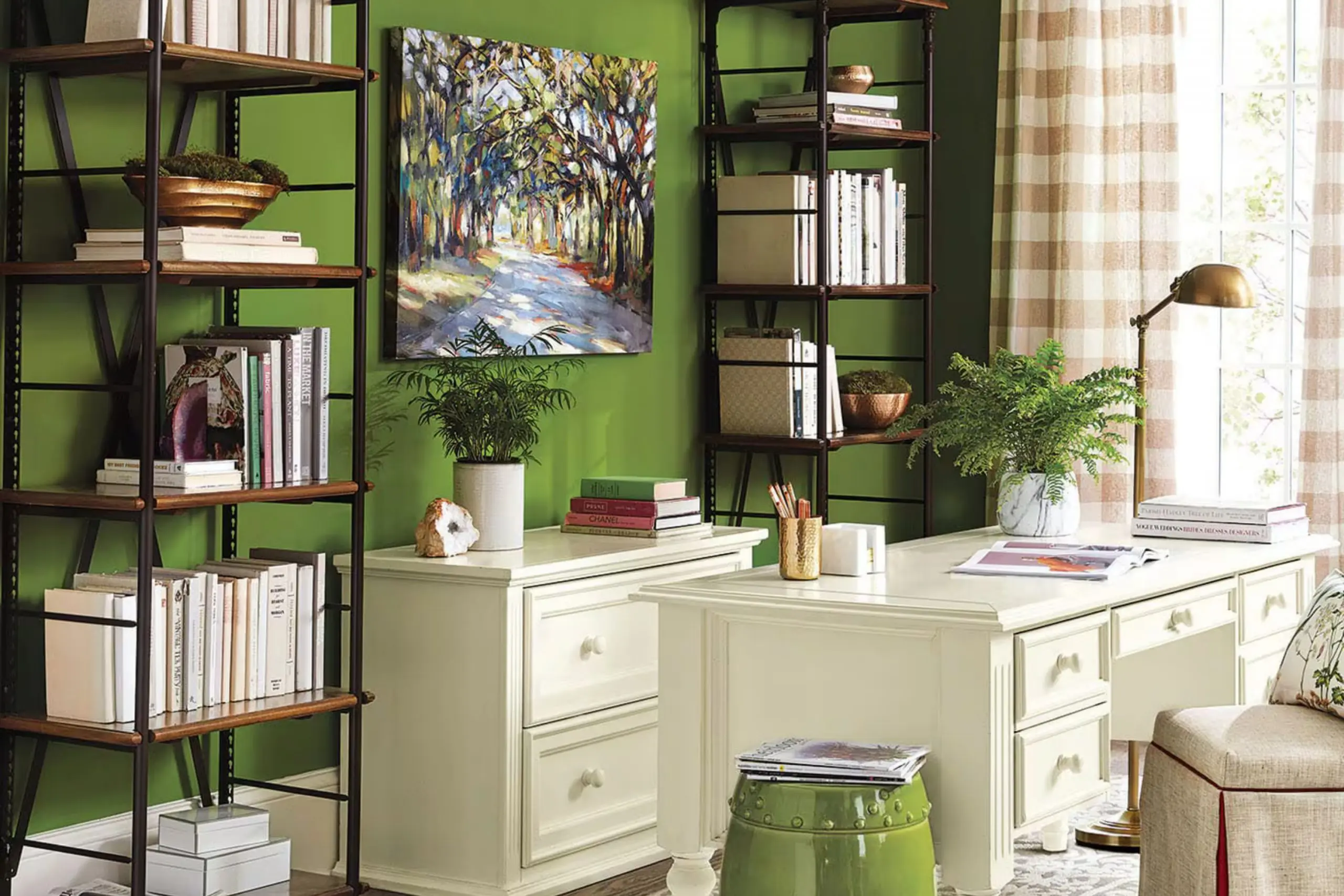 Another great use for Gecko is in a home office or a study area. The color’s brightness helps keep the atmosphere light and can potentially aid in maintaining focus and boosting productivity.
