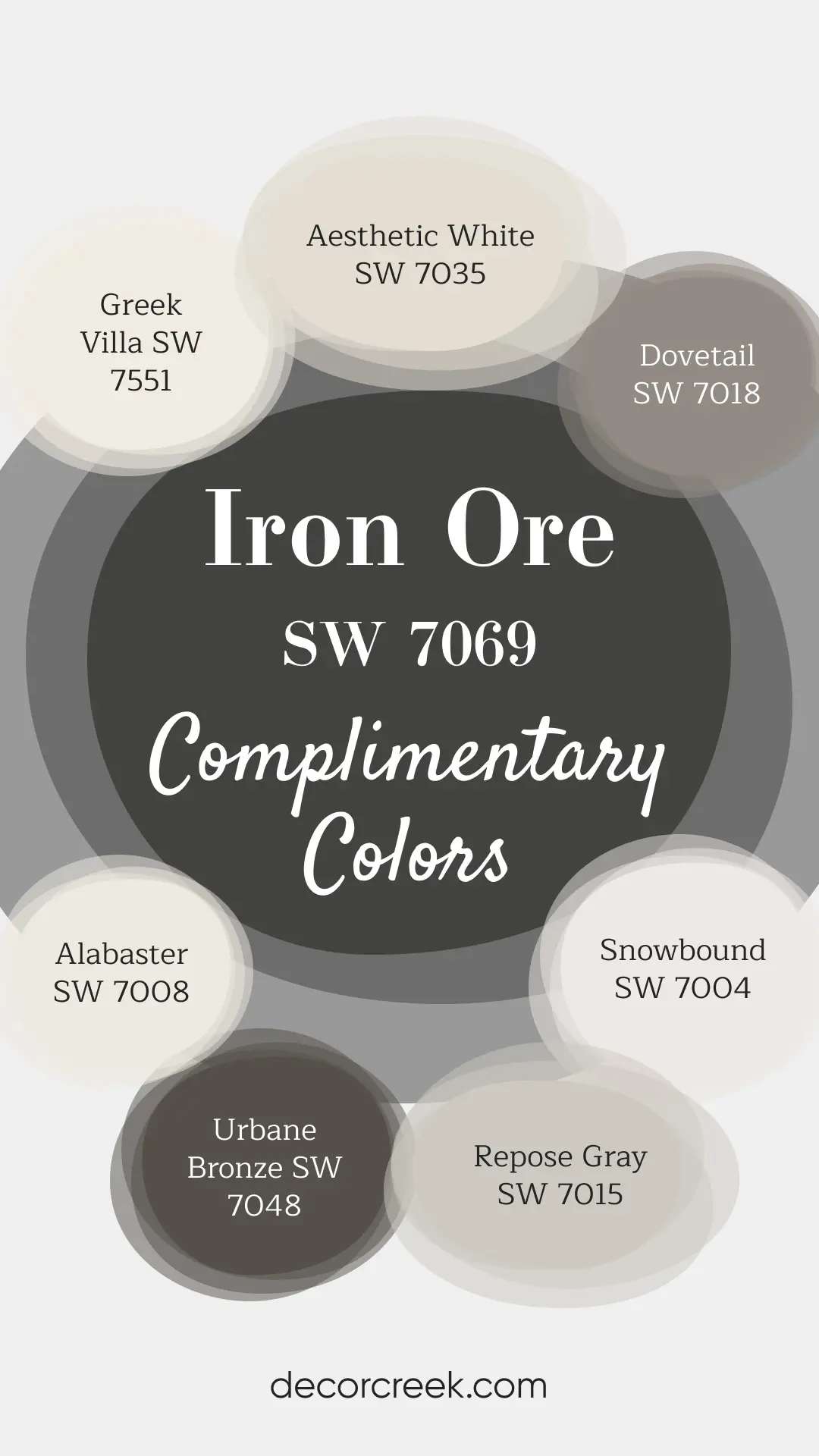 Coordinating colors are hues that complement each other and work together to enhance the overall aesthetic of a space, ensuring that no color clashes with another. These colors are selected based on their ability to support and balance the primary color in question, in this case, Iron Ore SW 7069 by Sherwin-Williams, a deep, dark gray with a rich tone.