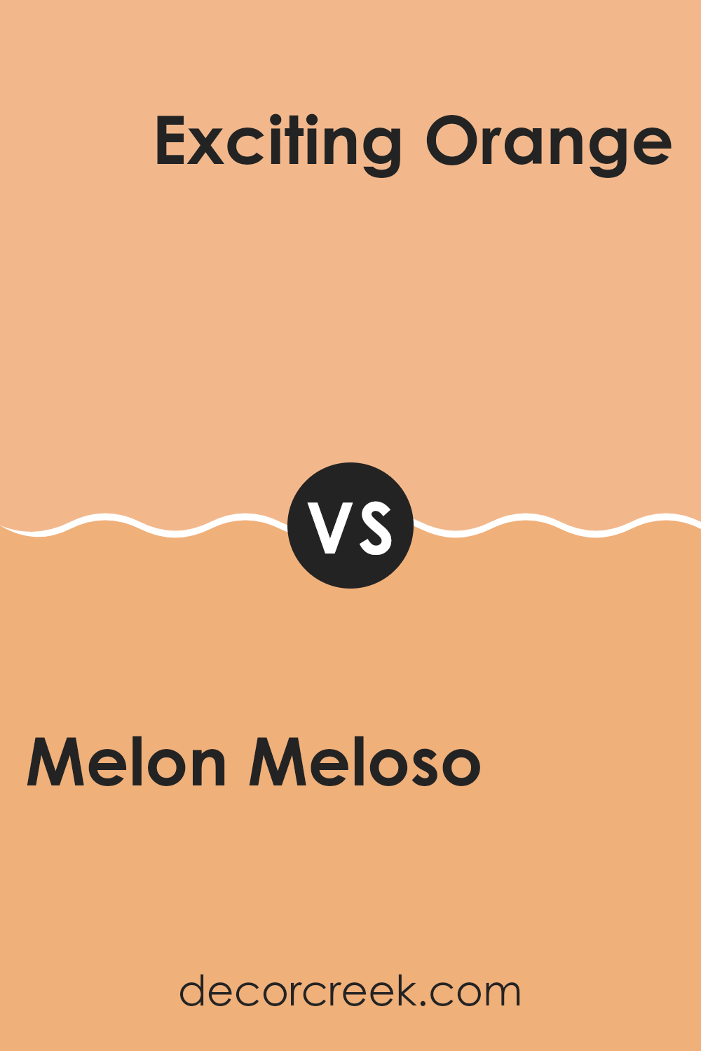 Melon Meloso and Exciting Orange, both by Sherwin Williams, are vivid and energetic colors, but they display distinctly different vibes. Melon Meloso is a softer, creamy orange that gives off a gentle, welcoming feel, making it great for creating a cozy and warm atmosphere in a room. It’s less intense and has a hint of peachiness which softens its overall appearance.