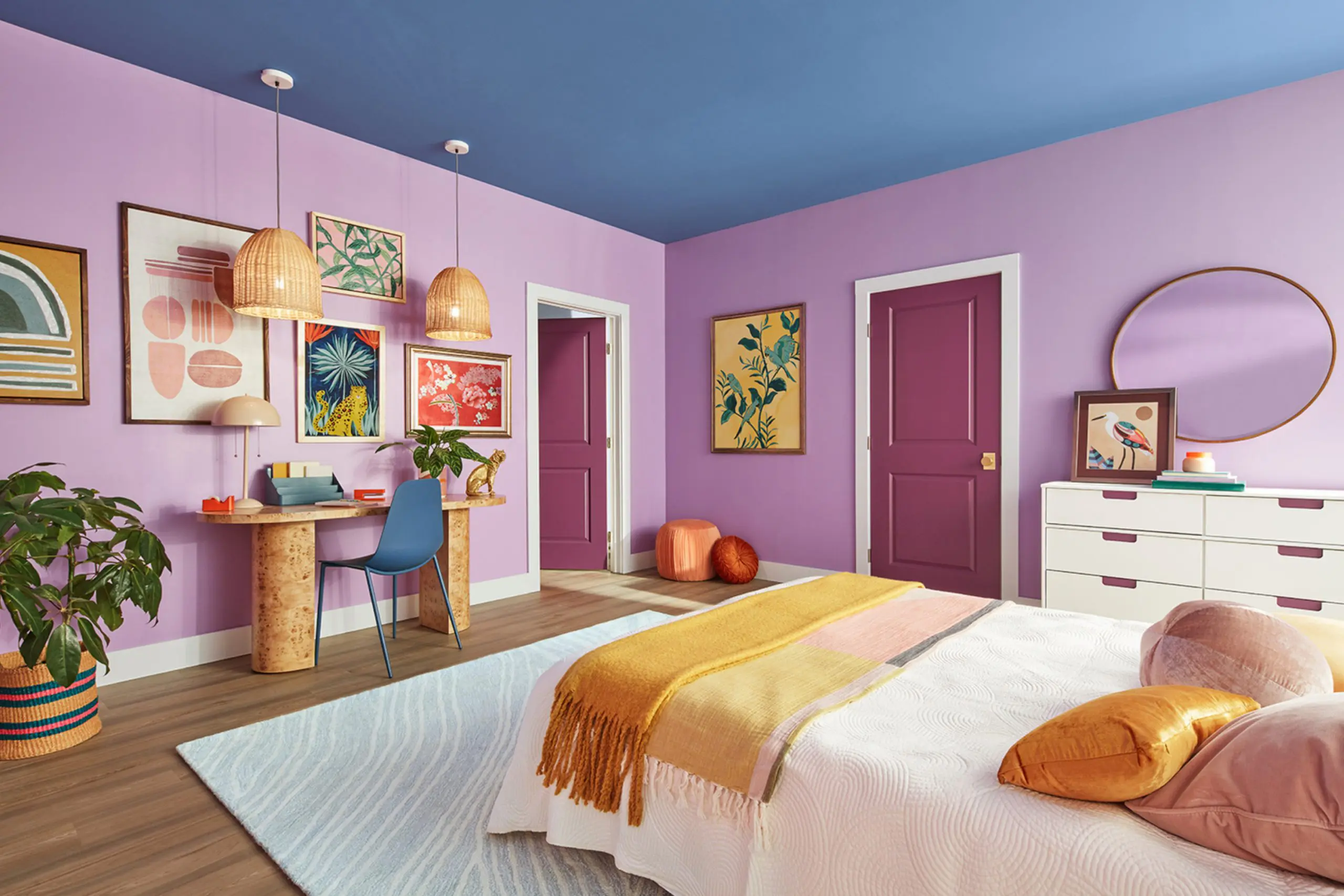 On the other hand, Rosebay is a more vibrant purple with a hint of pink. This color is lively and energetic, bringing a cheerful and bold touch to any area. It works well in rooms where you want to encourage creativity and liveliness.