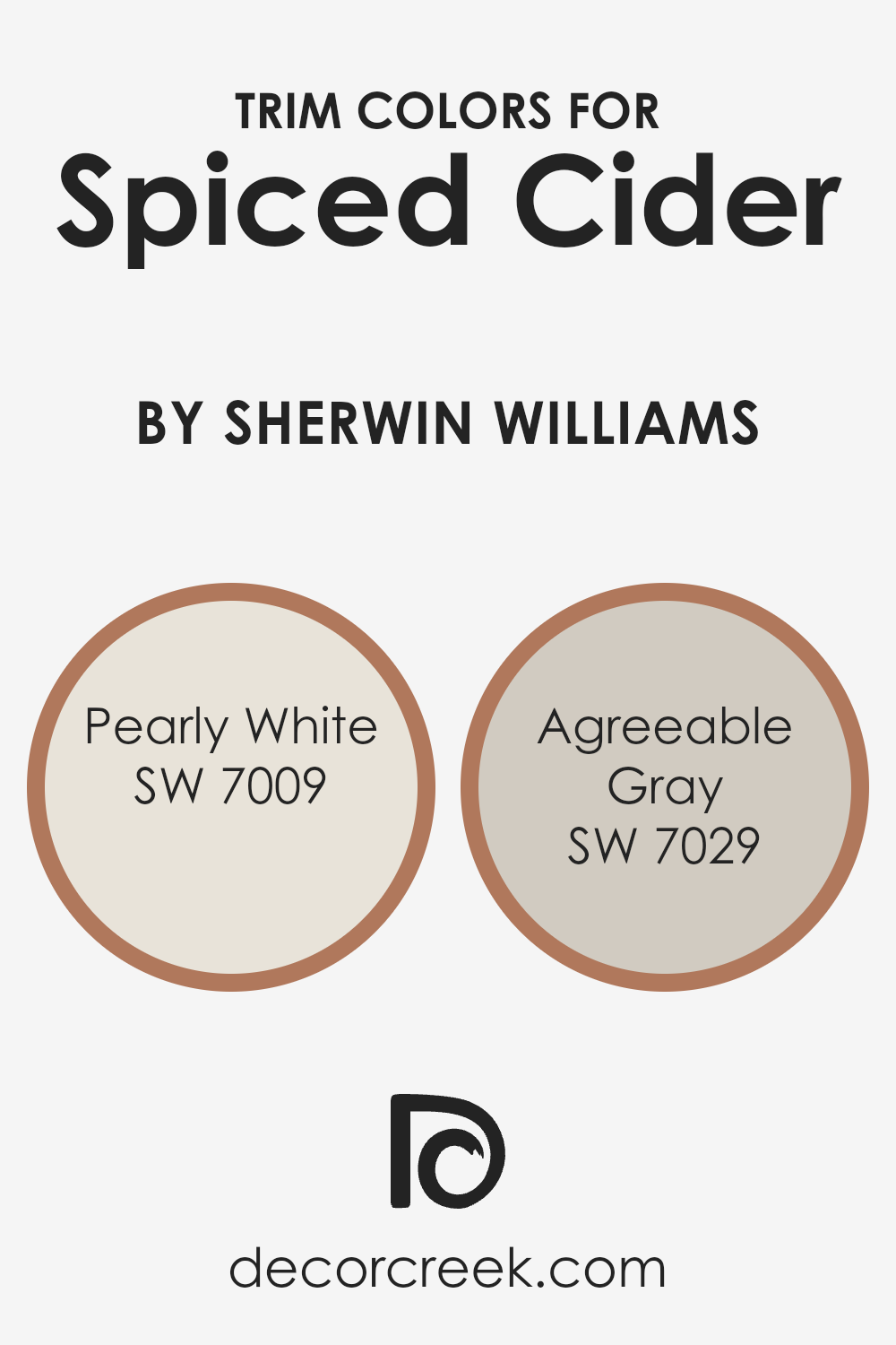 Using colors like Pearly White or Agreeable Gray for trims can ground Spiced Cider’s depth, offering a clean and defined finish that highlights architectural features and frames the space in an aesthetically pleasing manner.