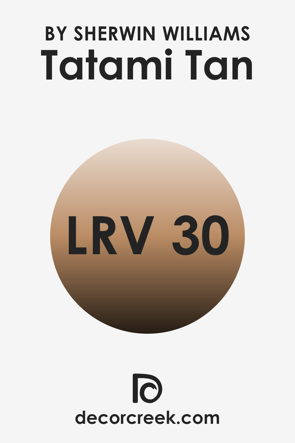 For the color Tatami Tan with an LRV of 30.262, this means it’s on the darker side of the spectrum. It absorbs a good bit of light, so when used on walls, it can create a warm and inviting atmosphere but may also make the room feel more intimate or even a bit smaller. This color won’t reflect a lot of light, so it might be best suited for areas where you want a snug and comfortable feel rather than a bright and airy one. Since this tan color has a relatively low LRV, it’s important to consider the amount of natural or artificial light in the room to ensure it doesn’t feel too dark.